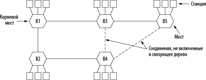 Илл. 4.36. Связующее дерево, соединяющее пять мостов. Пунктирными линиями показаны соединения, которые в него не входят