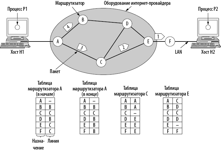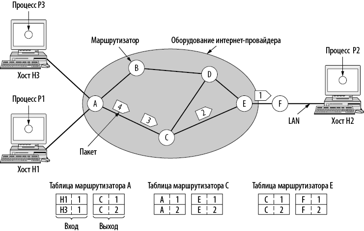 В маршрутизаторе A пакеты 1, 2 и 3, поступившие на вход, кратковременно сохраняются для верификации контрольной суммы. Затем в соответствии с таблицей А каждый пакет отправляется в новом фрейме по исходящему соединению на маршрутизатор С. Далее пакет 1 уходит на Е, затем — на F. После этого он передается внутри фрейма по LAN на хост Н2. Пакеты 2 и 3 следуют по тому же маршруту.