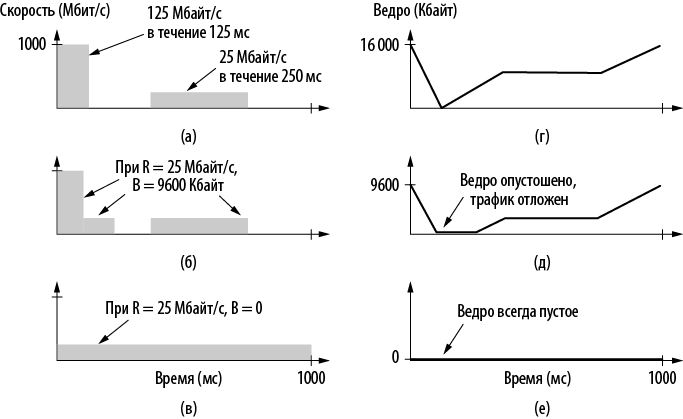 Алгоритмы дырявого и маркерного ведра ограничивают постоянную скорость потока, при этом пропуская кратковременные всплески трафика (также ограниченные максимальным значением) без искусственных задержек. Чтобы снизить нагрузку на сеть, шейпер «дырявого ведра» сглаживает крупные всплески трафика. Представьте компьютер, который производит данные со скоростью 1000 Мбит/с (125 млн байт в секунду); первая связь сети работает на той же скорости. Хост генерирует схему трафика, показанную на илл. 5.24 (а). Эта схема является неравномерной. Средняя скорость составляет 200 Мбит/с, хотя хост отправляет пиковый объем трафика в 16 000 Кбайт на максимальной скорости 1000 Мбит/с (за 1/8 с).