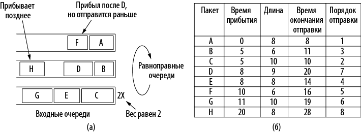 отправки B; время равно 20. Аналогичным образом время завершения отправки F равно 16. Если новых пакетов нет, порядок окончания отправки пакетов будет таким: A, B, F, D (хотя F прибывает после D). Может случиться так, что в верхний поток поступит небольшой пакет, который будет передан раньше D. Но он обойдет D только в том случае, если отправка D еще не началась. При использовании равноправных очередей передача пакета не прерывается. Алгоритм передает пакеты целиком и потому является лишь приближением идеальной схемы побайтовой передачи. Но это достаточно хорошее приближение: в каждый момент времени передается ровно один пакет.