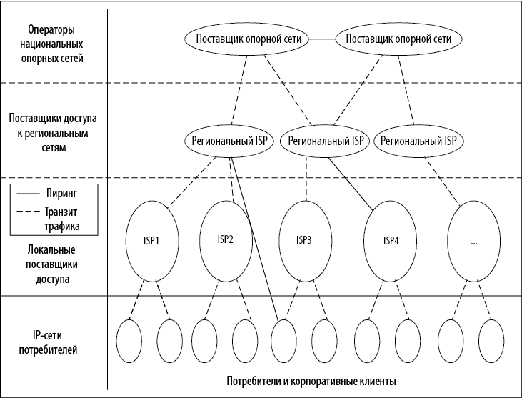Небольшая горстка поставщиков услуг транзита (transit providers), включая AT&T и Level 3, контролирует крупные международные опорные сети с тысячами маршрутизаторов, соединенных высокоскоростными оптоволоконными линиями связи. Их также называют tier-1-операторами8 (tier-1 operators). Они не платят за транзит трафика и формируют опорную сеть интернета, поскольку все остальные должны подключаться к ним для доступа ко всему интернету.
