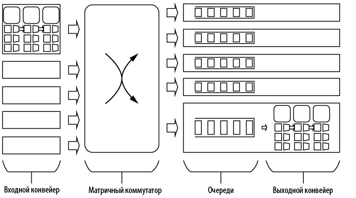Современные чипсеты, такие как Barefoot Tofino, позволяют выполнять протоколонезависимую обработку нестандартных пакетов на входе и на выходе (илл. 5.45). Благодаря этому можно анализировать временные параметры очередей (например, время нахождения в очереди отдельных пакетов), а также производить нестандартную инкапсуляцию и декапсуляцию. Кроме того, можно применять метод активного управления очередью (к примеру, RED) к выходным очередям, используя метаданные, получаемые из входных очередей. В настоящее время исследуются способы использования этой архитектуры для управления трафиком и перегрузками, в частности, путем мелкоструктурной оценки параметров очередей (Чэнь и др.; Chen et al., 2019).