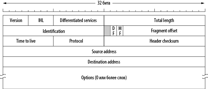 Мы начнем изучение сетевого уровня интернета с формата IPv4-дейтаграмм. Такая дейтаграмма состоит из заголовка и основной части (пользовательских данных). Заголовок содержит фиксированную 20-байтную часть, а также необязательную часть, длина которой варьируется. Формат заголовка показан на илл. 5.47. Биты передаются слева направо и сверху вниз, то есть старший бит поля Version (Версия) идет первым. (Такой порядок байтов называется «от старшего к младшему» («big-endian»). На компьютерах с порядком «от младшего к старшему» («little-endian»), например Intel x86, требуется программное преобразование, как при передаче, так и при приеме.) Сегодня уже совершенно ясно, что для IP лучше было использовать порядок «от младшего к старшему», но на момент создания протокола это было не столь очевидно.