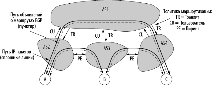 Илл. 5.68. Политика маршрутизации между четырьмя АС