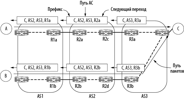 Наконец, существует стратегия, согласно которой выбирается самый дешевый маршрут в сети провайдера. Пример ее реализации показан на илл. 5.69. Пакеты из A в C покидают AS1 через верхний маршрутизатор R1a. Пакет из B выходит через нижний маршрутизатор R1b. Это происходит, поскольку A и B выбирают наименее затратный способ выхода из AS1. А поскольку они расположены в разных частях сети провайдера, наилучшие пути для них различаются. То же самое происходит, когда пакеты проходят через AS2. На последнем участке AS3 должна переправить пакет из B по своей сети.