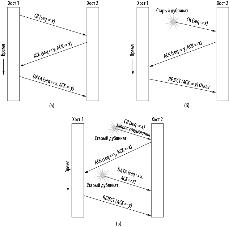 Для разрешения этой специфической проблемы Томлинсон (1975) предложил «тройное рукопожатие» (three-way handshake). Этот протокол установления соединения предполагает, что одна из сторон проверяет, является ли соединение все еще действующим. Нормальная процедура установления соединения показана на илл. 6.11 (а). Хост 1 выбирает порядковый номер x и отправляет сегмент CONNECTION REQUEST, содержащий этот номер, хосту 2. Хост 2 отвечает сегментом ACK, подтверждая x и объявляя свой начальный порядковый номер y. Наконец, хост 1 подтверждает выбранный хостом 2 номер в первом отправленном им информационном сегменте.