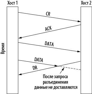 Асимметричный разрыв связи является внезапным и может привести к потере данных. Рассмотрим сценарий на илл. 6.12. После установления соединения хост 1 отправляет сегмент, который успешно достигает хоста 2. Затем хост 1 передает другой сегмент. К несчастью, хост 2 отправляет DISCONNECTION REQUEST прежде, чем приходит второй сегмент. В результате соединение разрывается, а данные теряются.