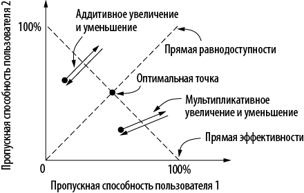 Рассматривая бинарный сигнал о перегрузке, Чиу и Джейн (Chiu and Jain, 1989) пришли к выводу, что закон аддитивного увеличения и мультипликативного уменьшения (Additive Increase Multiplicative Decrease, AIMD) позволяет эффективно вычислять рабочий режим с учетом идеи равнодоступности. Чтобы это показать, они привели простой наглядный пример, в котором два соединения соперничают друг с другом за ресурс общего канала. На илл. 6.24 пропускная способность для пользователя 1 располагается на оси X, а для пользователя 2 — на оси Y. При справедливом распределении оба пользователя получают одинаковое количество ресурса. Оно обозначено с помощью прямой равнодоступности (пунктирная линия). Когда суммарная пропускная способность, выделяемая всем пользователям, составляет 100 % (то есть равна емкости канала), распределение эффективно. Оно располагается на прямой эффективности. Когда суммарная