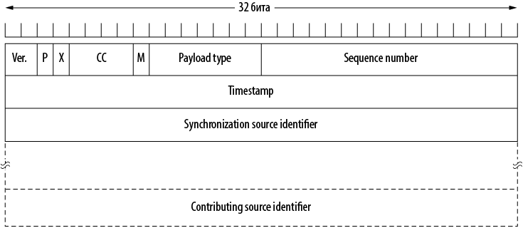 Бит P указывает на то, что размер пакета кратен 4 байтам за счет байтов заполнения. В последнем байте заполнения содержится общее число байтов заполнения. Бит Х сообщает, что присутствует заголовок расширения. Формат и назначение такого заголовка не определяются. Обязательным для него является только то, что первое слово расширения должно содержать общую длину расширения. Это запасная возможность для разнообразных непредсказуемых требований в будущем.