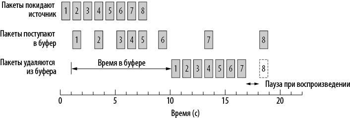 К сожалению, пакет 8 задерживается настолько, что не успевает прибыть к тому моменту, когда он должен быть воспроизведен. В таком случае возможны два варианта. Проигрыватель может пропустить 8-й пакет и перейти к следующим пакетам. Или же он может остановить воспроизведение, пока не придет 8-й пакет, и тем самым создать неприятную паузу в музыке или фильме. Если приложение работает в режиме реального времени (например, при звонке через интернет), то пакет, скорее всего, будет пропущен. Такие приложения не очень хорошо функционируют в режиме ожидания. В приложениях, работающих с потоковым мультимедиа, проигрыватель может на время остановить воспроизведение. Чтобы улучшить ситуацию, можно начать воспроизведение еще позже и использовать буфер большего размера. Проигрыватели потокового аудио и видео часто используют буферы размером около 10 с, чтобы все пакеты (кроме утерянных) успели прийти вовремя. Приложения, работающие в реальном времени (например, видеоконференции) и требующие быстрой ответной реакции, используют маленькие буферы.