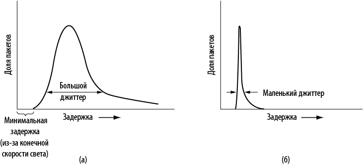 Для равномерного воспроизведения очень важна задержка воспроизведения (playback point). Это время, в течение которого получатель ожидает медиаданные, прежде чем начать воспроизведение. Этот параметр зависит от джиттера. Различие между соединением с маленьким и большим джиттером показано на илл. 6.33. Средняя задержка может не слишком отличаться, но при большом джиттере может потребоваться задержка воспроизведения, захватывающая 99 % пакетов (намного больше, чем при маленьком джиттере).