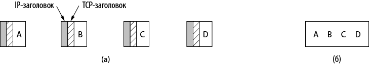 Илл. 6.35. (а) Четыре 512-байтных сегмента, отправленные как отдельные IP-дейтаграммы. (б) 2048 байт данных, доставленные приложению с помощью одного вызова процедуры READ