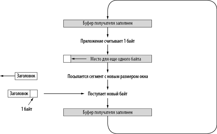 Еще одна проблема, способная значительно снизить производительность протокола TCP, известна под названием синдрома глупого окна (silly window syndrome) (Кларк; Clark, 1982). Ее суть в том, что данные пересылаются TCP-подсистемой крупными блоками, но принимающая сторона интерактивного приложения считывает их посимвольно. Чтобы разобраться в этом, рассмотрим илл. 6.41. Начальное состояние таково: TCP-буфер приемной стороны полон (то есть размер его окна равен нулю), и отправителю это известно. Затем интерактивное приложение читает один символ из TCP-потока. Принимающая TCP-подсистема радостно сообщает отправителю, что размер окна увеличился и что он теперь может отправить 1 байт. Отправитель повинуется и передает 1 байт. Буфер снова заполняется, о чем получатель сообщает с помощью подтверждения для 1-байтного сегмента с нулевым размером окна. И так может продолжаться вечно.