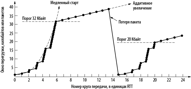 Передачи на круге 13 оказываются неудачными (как и положено), и одна из них заканчивается потерей пакета. Отправитель обнаруживает это после получения трех дубликатов подтверждений. Потерянный пакет передается повторно, а пороговое значение устанавливается в половину текущего размера окна (на данный момент это 40 Кбайт, то есть половина составляет 20 Кбайт), и снова запускается медленный старт. Для нового запуска с окном в один сегмент требуется еще один круг. За это время все ранее переданные данные, включая копию потерянного пакета, успевают покинуть сеть. Окно перегрузки снова увеличивается в соответствии с алгоритмом медленного старта до тех пор, пока оно не дойдет до порогового значения в 20 Кбайт. После этого рост окна снова становится линейным. Так будет продолжаться до следующей потери пакета, которая будет выявлена с помощью дубликатов подтверждений или после наступления тайм-аута (или же до заполнения окна получателя).