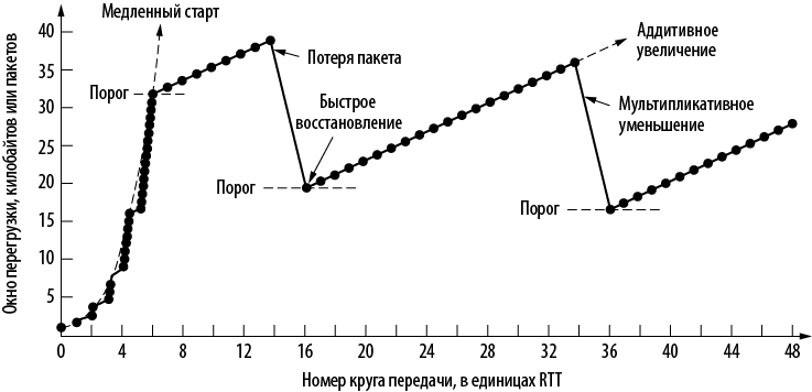выбора начального окна, были устранены различные примеры неоднозначности. Усовершенствования коснулись и механизмов восстановления после потери двух или более пакетов. Так, версия TCP NewReno использует номера частичных подтверждений, полученных после повторной передачи одного потерянного пакета для восстановления другого (Хо; Hoe, 1996) (см. RFC 3782). С середины 1990-х годов стали появляться варианты описанного выше алгоритма, основанные на других законах управления. К примеру, в системе Linux используется CUBIC TCP (Ха и др.; Ha et al., 2008), а в Windows — Compound TCP (Тань и др.; Tan et al., 2006).