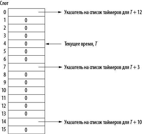 Когда работает таймер, указатель текущего времени перемещается по циклическому расписанию вперед на один слот. Если запись, на которую он указывает, не нулевая, обрабатываются все таймеры этого списка. Многочисленные варианты этой концепции обсуждаются у Варгезе и Лаука (Varghese and Lauck, 1987).