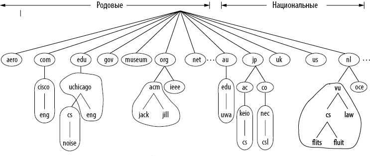 Илл. 7.6. Часть пространства имен DNS, разделенная на зоны (они обведены)