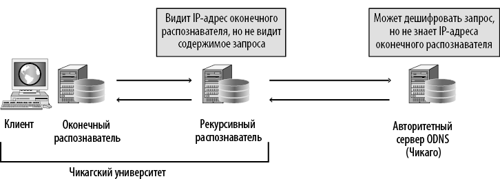 Даже протоколы DoT и DoH не могут полностью решить проблемы DNS в сфере конфиденциальности, поскольку оператору локального распознавателя все равно приходится предоставлять частную информацию, а именно содержимое DNS-запросов и IP-адреса клиентов, от которых они поступают. Недавно в качестве альтернативы были предложены улучшенные версии DNS и DoH, в частности «забывчивый DNS» (oblivious DNS, ODNS) (Шмитт и др.; Schmitt et al., 2019) и «забывчивый DoH» (oblivious DoH, ODoH) (Киннир и др.; Kinnear et al., 2019). Благодаря этому оконечный распознаватель шифрует исходный запрос перед тем, как передать его локальному распознавателю, а тот передает его авторитетному серверу имен. Сервер может выполнить дешифрование и разрешить запрос, но при этом ему неизвестен идентификатор или IP-адрес оконечного распознавателя, который инициировал запрос. Схема этих взаимодействий представлена на илл. 7.8.