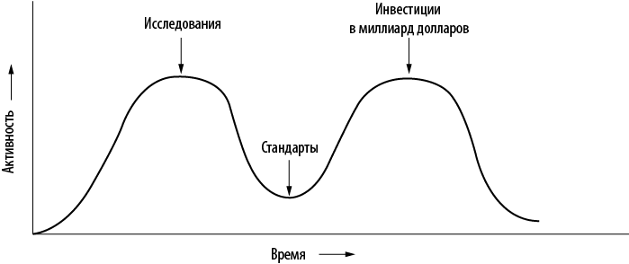 На этом графике отражена активность, сопутствующая любой новой разработке. Возникновение новой темы приводит к колоссальному взрыву исследовательской деятельности в виде научных работ, обсуждений, статей и конференций. Через какое-то время ажиотаж понемногу угасает, однако разработку замечают крупные корпорации, и в нее вливаются миллиардные инвестиции.