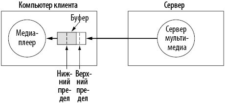Илл. 7.34. Медиаплеер буферизует входящую информацию с медиасервера и воспроизводит медиаданные из буфера, а не напрямую из сети