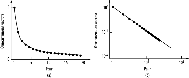Илл. 7.42. Распределение Ципфа. (а) Линейная шкала. (б) Логарифмическая шкала по обеим осям