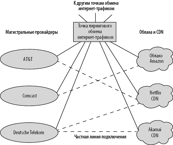 Магистральные сети позволяют многим облачным сервисам и CDN связываться друг с другом через точки пирингового обмена, если между ними нет частной выделенной линии подключения. Так, к точке обмена интернет-трафиком DE-CIX в Франкфурте подключено около 2000 сетей, а к точкам обмена AMS-IX в Амстердаме и LINX в Лондоне — примерно по 1000. К каждой крупной точке обмена в США подключено по несколько сотен сетей. Эти точки также соединены между собой одной или несколькими оптоволоконными линиями OC-192 (9,6 Гбит/с) и/или OC-768 (38,5 Гбит/с). Точки пирингового обмена и крупные коммуникационные сети, которые в них соединяются друг с другом, образуют магистраль интернета, к которой напрямую подключено большинство облаков и CDN.