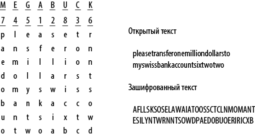 Подстановочные шифры «маскируют» символы открытого текста, но не меняют порядок их следования. Перестановочные шифры (transposition ciphers), наоборот, меняют порядок следования символов, но не «маскируют» их. На илл. 8.10 показан простой перестановочный шифр с колоночной перестановкой. Ключом к такому шифру служит слово или фраза, в которых нет повторяющихся букв. В данном примере в качестве ключа используется слово MEGABUCK. Цель ключа — пронумеровать колонки. Первой колонкой становится колонка под буквой, расположенной ближе всего к началу алфавита, и т.д. Открытый текст записывается горизонтально в строках. Зашифрованный текст читается по колонкам, начиная с колонки с младшей ключевой буквой.