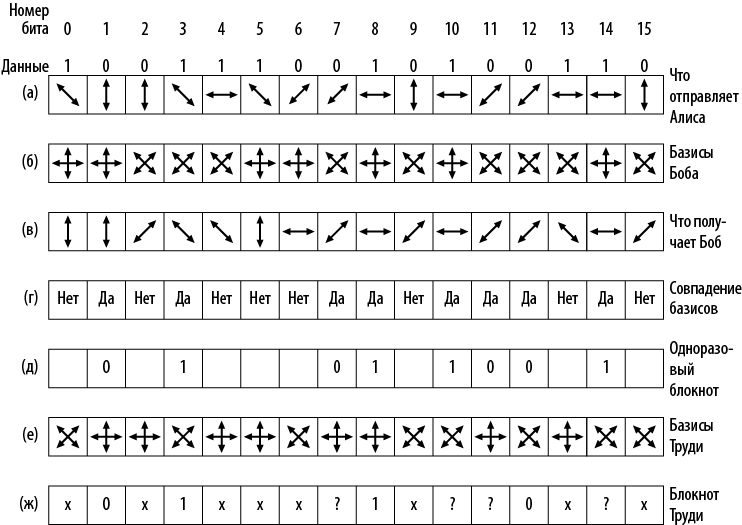 Чтобы выяснить, какие базисы подставлены правильно, а какие — нет, Боб открытым текстом сообщает Алисе, что именно он использовал при приеме каждого бита. Затем она отвечает ему (также открытым текстом), какие базисы он подобрал верно (илл. 8.12 (г)). Владея этой информацией, Алиса и Боб могут составить битовую строку корректных предположений (илл. 8.12 (д)). В среднем длина этой строки равна половине полной длины исходной строки, но поскольку это знают обе стороны, они могут использовать строку корректных предположений в качестве одноразового блокнота. Все, что Алисе надо сделать, — это передать битовую строку, длина которой немного превышает удвоенную длину одноразового блокнота. Проблема решена.