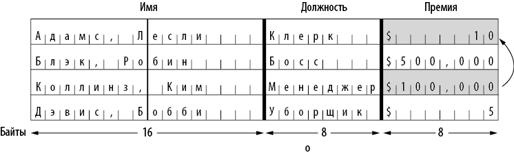 На илл. 8.15 показано начало компьютерного файла; это список годовых премий сотрудников компании. Файл состоит из последовательных 32-разрядных записей (по одной на сотрудника) следующего формата: 16 байт на имя, 8 байт на должность и 8 байт на премию. Каждый из шестнадцати 8-байтных блоков (пронумерованных от 0 до 15) кодируется шифром DES.