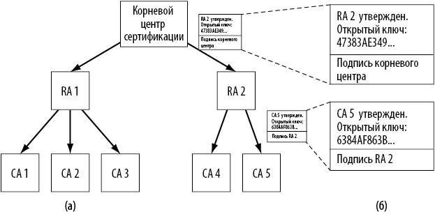PKI состоит из множества компонентов — пользователей, CA, самих сертификатов, а также каталогов. Она предоставляет возможность структурировать эти компоненты и определяет стандарты, касающиеся различных документов и протоколов. Одним из простейших видов PKI является иерархия CA (илл. 8.28). На рисунке представлены три уровня, но их может быть как больше, так и меньше. CA верхнего уровня (корневой центр сертификации) сертифицирует CA второго уровня — назовем их региональными (промежуточными) центрами сертификации (Regional Authorities, RA), так как они могут обслуживать некоторый географический регион (например, страну или континент). Этот термин не стандартизован. Названия для уровней иерархии вообще не оговариваются стандартом. RA занимаются легализацией реальных CA, эмитирующих сертификаты стандарта X.509 для физических и юридических лиц. Когда корневой центр авторизует RA, он генерирует подтверждающий полномочия RA сертификат X.509, включает в него открытый ключ нового RA, подписывает его и передает RA. Аналогичным образом RA взаимодействуют с CA: выдают и подписывают сертификаты, содержащие открытые ключи CA и признающие легальность их деятельности.