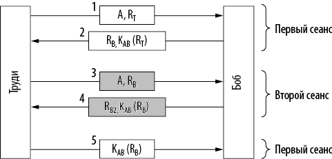 Однако Труди может открыть второй сеанс сообщением 3 и подать в качестве запроса Бобу его собственный запрос, взятый из сообщения 2. Боб спокойно шифрует его и отсылает обратно KAB(RB) в сообщении 4. Сообщения второго сеанса выделены в нашей схеме серым цветом. Труди получила нужную информацию, поэтому она завершает первый сеанс и прерывает второй. Теперь Боб уверен, что Труди — это Алиса, поэтому предоставляет ей доступ к банковским счетам Алисы и позволяет перевести деньги с ее текущего счета на секретный счет в швейцарском банке без малейших колебаний.