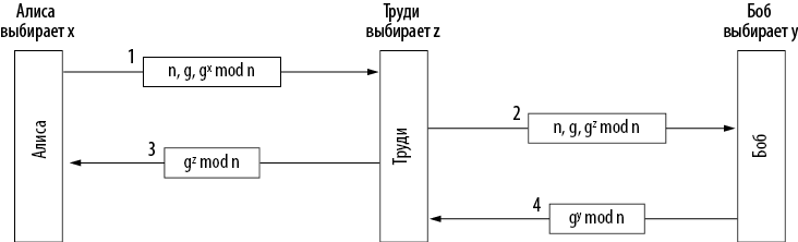 Несмотря на всю элегантность алгоритма Диффи — Хеллмана, есть одна проблема: когда Боб получит три числа (47, 3, 28), как удостовериться в том, что их отправила Алиса, а не Труди? Нет никакого способа узнать это. К сожалению, Труди может воспользоваться этим, чтобы обмануть Алису и Боба (илл. 8.35). Пока Алиса и Боб устанавливают значения x и y, Труди выбирает свое случайное число z. Алиса отсылает Бобу сообщение 1. Труди перехватывает его и вместо него отправляет Бобу сообщение 2, используя правильные значения g и n (которые передавались открытым текстом), но со своим значением z вместо x. Она также отсылает сообщение 3 обратно Алисе. Позднее Боб отправляет Алисе сообщение 4, которое Труди снова перехватывает и хранит у себя.