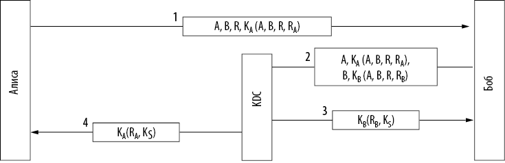 KDC сравнивает общие идентификаторы R в обеих частях сообщения. Они могут не совпадать, если Труди подменила R в сообщении 1 или заменила часть сообщения 2. Если оба числа R совпадают, KDC считает сообщение от Боба достоверным. Затем он формирует ключ сеанса KS и шифрует его дважды: для Алисы и для Боба. Каждое сообщение содержит случайное число получателя как доказательство того, что эти сообщения сгенерировал KDC, а не Труди. К этому моменту Алиса и Боб обладают одним и тем же ключом сеанса и могут начать коммуникацию. После первого же обмена данными они увидят, что обладают одинаковыми копиями ключа сеанса KS, и процесс аутентификации можно будет считать завершенным.