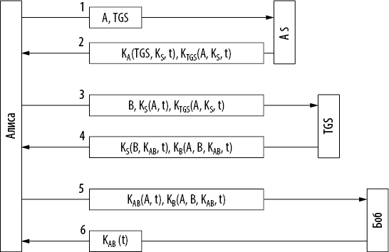 После регистрации в сети Алиса может сообщить рабочей станции, что она хочет вступить в контакт с файловым сервером, то есть Бобом. Рабочая станция отсылает TGS сообщение 3 с просьбой выдать удостоверение для этого взаимодействия. Ключевым элементом запроса является удостоверение KTGS(A, KS, t), которое зашифровано секретным ключом TGS и используется для подтверждения личности отправителя. В ответном сообщении 4 TGS передает созданный им ключ сеанса KAB, которым будут пользоваться Алиса и Боб. Он возвращает две версии этого ключа. Один ключ зашифрован ключом сеанса KS, чтобы его могла прочитать Алиса. Второй ключ представляет собой еще одно удостоверение, зашифрованное ключом Боба KB (чтобы его мог прочитать Боб).