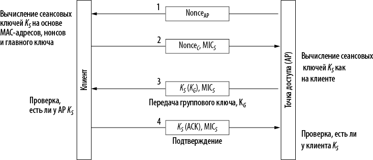 В последних двух сообщениях AP выдает клиенту общий ключ KG, и клиент подтверждает его получение. Это позволяет AP удостовериться, что у клиента есть верные ключи сеанса, а клиенту — что они есть у AP. Общий ключ используется для передачи трафика по 802.11 LAN. Поскольку в результате «рукопожатия» оказывается, что у каждого клиента есть свои ключи шифрования, ни один из этих ключей не может быть использован AP для передачи пакетов всем клиентам беспроводной сети. Можно было бы отправить отдельную копию со своим ключом каждому клиенту. Вместо этого используется общий ключ, так что широковещательный трафик может быть передан один раз и получен всеми клиентами. Этот ключ должен обновляться по мере того, как клиенты уходят из сети и присоединяются к ней.