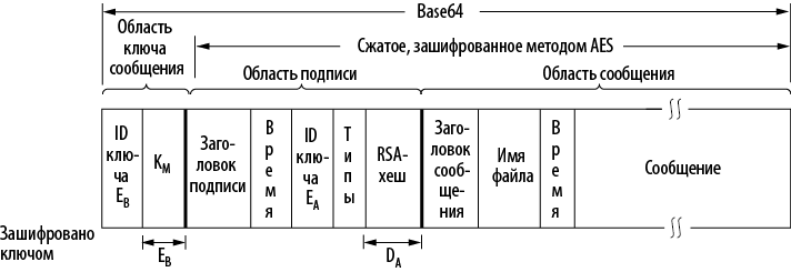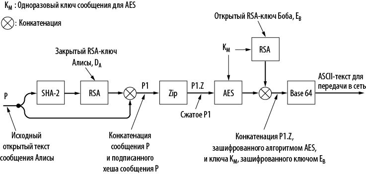 Далее PGP предлагает Алисе ввести случайную текстовую строку. При формировании 256-разрядного AES-ключа сообщения KM учитывается как содержание, так и скорость ввода. (В литературе по PGP этот ключ называют сеансовым, что является неправильным употреблением термина, так как никакого сеанса здесь нет.) Затем P1.Z шифруется алгоритмом AES с помощью ключа KM, который, в свою очередь, шифруется открытым ключом Боба EB. Два этих компонента объединяются и преобразуются в кодировку base64, о которой мы говорили в главе 7 при обсуждении стандартов MIME. Полученное в результате сообщение содержит только буквы, цифры и символы +, / и =. Таким образом, его можно поместить в тело письма стандарта RFC 822 с расчетом на то, что оно прибудет к адресату без изменений.