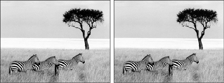 В качестве примера рассмотрим илл. 8.52 (а). На этой фотографии, сделанной одним из авторов данной книги в Кении, изображены три зебры, созерцающие акацию. Фотография на илл. 8.52 (б), выглядит точно так же, но обладает одной интересной особенностью. Дело в том, что в нее внедрен полный текст пяти самых известных пьес Шекспира: Гамлет, Король Лир, Макбет, Венецианский купец и Юлий Цезарь; суммарный объем текста превышает 700 Кбайт.