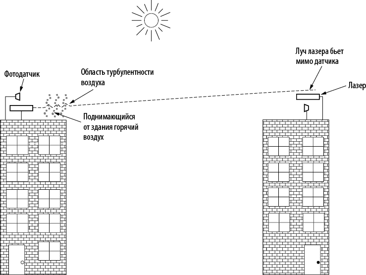 Однажды в 1990-х один из авторов книги, Эндрю Таненбаум, посетил конференцию, проходившую в современном европейском отеле. Организаторы заботливо предоставили конференц-зал с терминалами, чтобы участники могли проверять свою электронную почту во время нудных докладов. Местная телефонная компания отказалась проводить множество телефонных линий ради трех дней конференции. Тогда организаторы поставили на крыше лазер и нацелили его на здание факультета вычислительной техники своего университета, расположенное в нескольких километрах. В ночь перед мероприятием связь работала отлично. Однако в 9 утра следующего дня — ясного и солнечного — канал полностью отказал и не работал до вечера. В оставшиеся два дня повторилась та же картина. Только после конференции организаторы выяснили причину: в дневное время из-за солнечного тепла с крыши здания поднимались конвекционные потоки воздуха (илл. 2.11). Эти турбулентные потоки отклоняли лазерный луч, в результате чего он плясал вокруг датчика. Подобный эффект можно наблюдать над шоссе в жаркий день. Мораль истории такова: чтобы беспроводные оптические каналы связи хорошо работали не только в идеальных, но и в сложных условиях, необходимо проектировать их с учетом возможных погрешностей.
