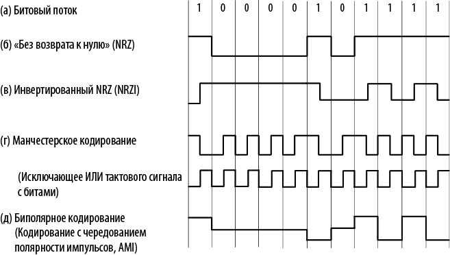 Илл. 2.14. Линейные коды. (а) Биты. (б) NRZ. (в) NRZI. (г) Манчестерское кодирование. (д) Биполярное кодирование (AMI)