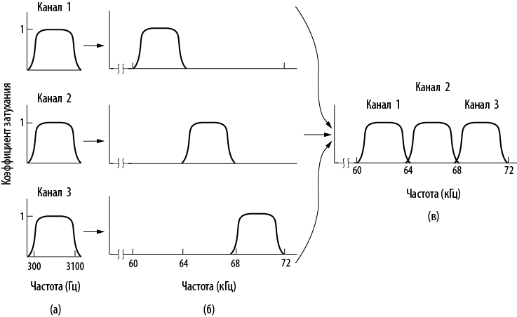 Илл. 2.19. Мультиплексирование с частотным разделением каналов (FDM). (а) Исходные полосы частот. (б) Полосы, сдвинутые по частоте. (в) Мультиплексированный канал