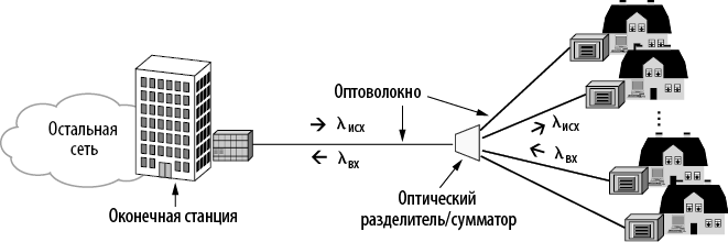 Подобная архитектура, представленная на илл. 2.31, называется пассивной оптической сетью (Passive Optical Network, PON). Обычно для входящей передачи данных все дома совместно используют одну длину волны, а для исходящей — другую.