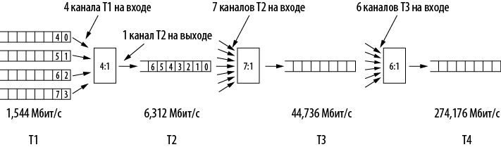 Илл. 2.33. Мультиплексирование каналов T1 в системы связи более высокого порядка