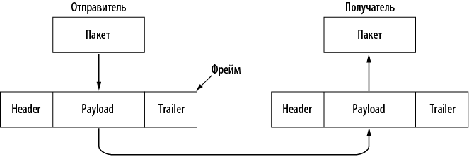 Для этих целей канальный уровень берет пакеты, полученные с сетевого уровня, и вставляет их в специальные фреймы (frames), также называемые кадрами, для передачи. В каждом фрейме содержатся поля Header (Заголовок), Payload (Пользовательские данные) и Trailer (Трейлер). Структура фрейма показана на илл. 3.1. Управление фреймами — это основная задача канального уровня. В следующих разделах мы более подробно изучим обозначенные выше цели. Кроме того, в ненадежных беспроводных сетях использование протоколов для улучшения канала связи часто увеличивает производительность в дальнейшем.
