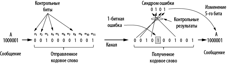 Если не все результаты проверки равны нулю, это означает, что обнаружена ошибка. Набор результатов проверки формирует синдром ошибки (error syndrome), с помощью которого ошибка выявляется и исправляется. На илл. 3.6 в канале произошла ошибка в одном бите. Результаты проверки равны 0, 1, 0 и 1 для k = 8, 4, 2 и 1 соответственно. Таким образом, синдром равен 0101 или 4 + 1 = 5. Согласно схеме, пятый бит содержит ошибку. Поменяв его значение (а это может быть контрольный бит или бит данных) и отбросив контрольные биты, мы получим правильное сообщение: букву «A» в кодах ASCII.