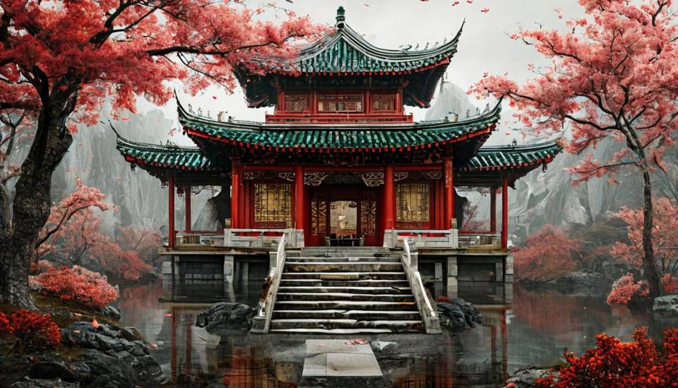 Следующий кадр: древнее здание в окружении гор, цветущих персиковых деревьев и… слой воды, залившей подступы к нему. Стоит понимать, как результат разливания волшебной водички. Огонь потушен.