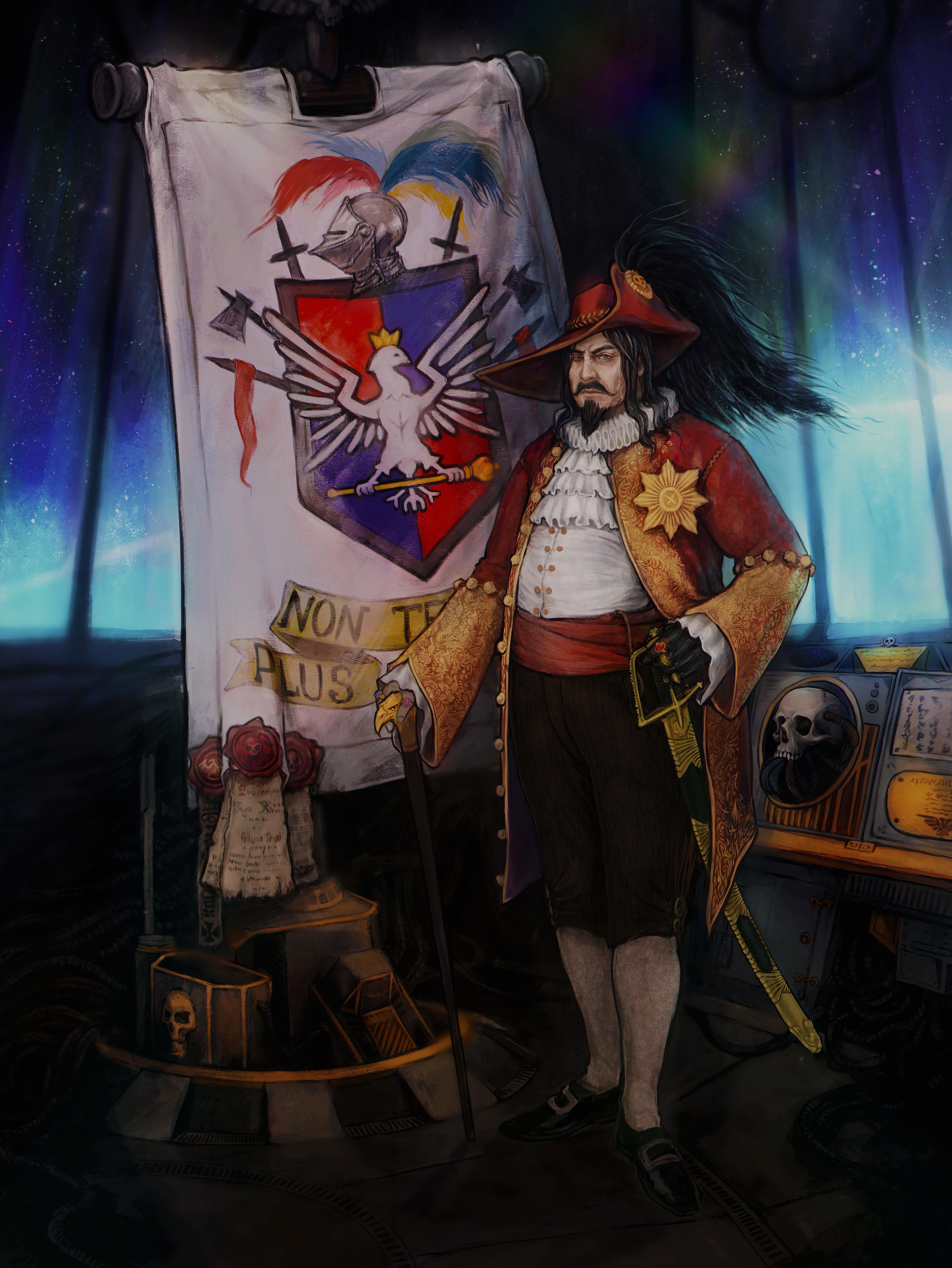 Красная шляпа с чёрными перьями, красный же атласный камзол с кружевным воротником, белые кюлоты, чулки и чёрные башмаки с пряжками. В ножнах у пояса висела позолоченная сабля.