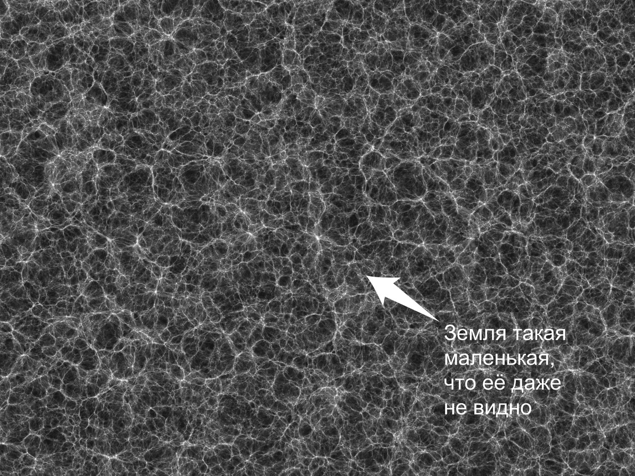 Современная космология; модель Вселенной в очень большом масштабе, где показаны миллиарды галактик, в каждой из которых насчитываются миллиарды звёзд, и у многих звёзд есть системы планет, похожие на Солнечную