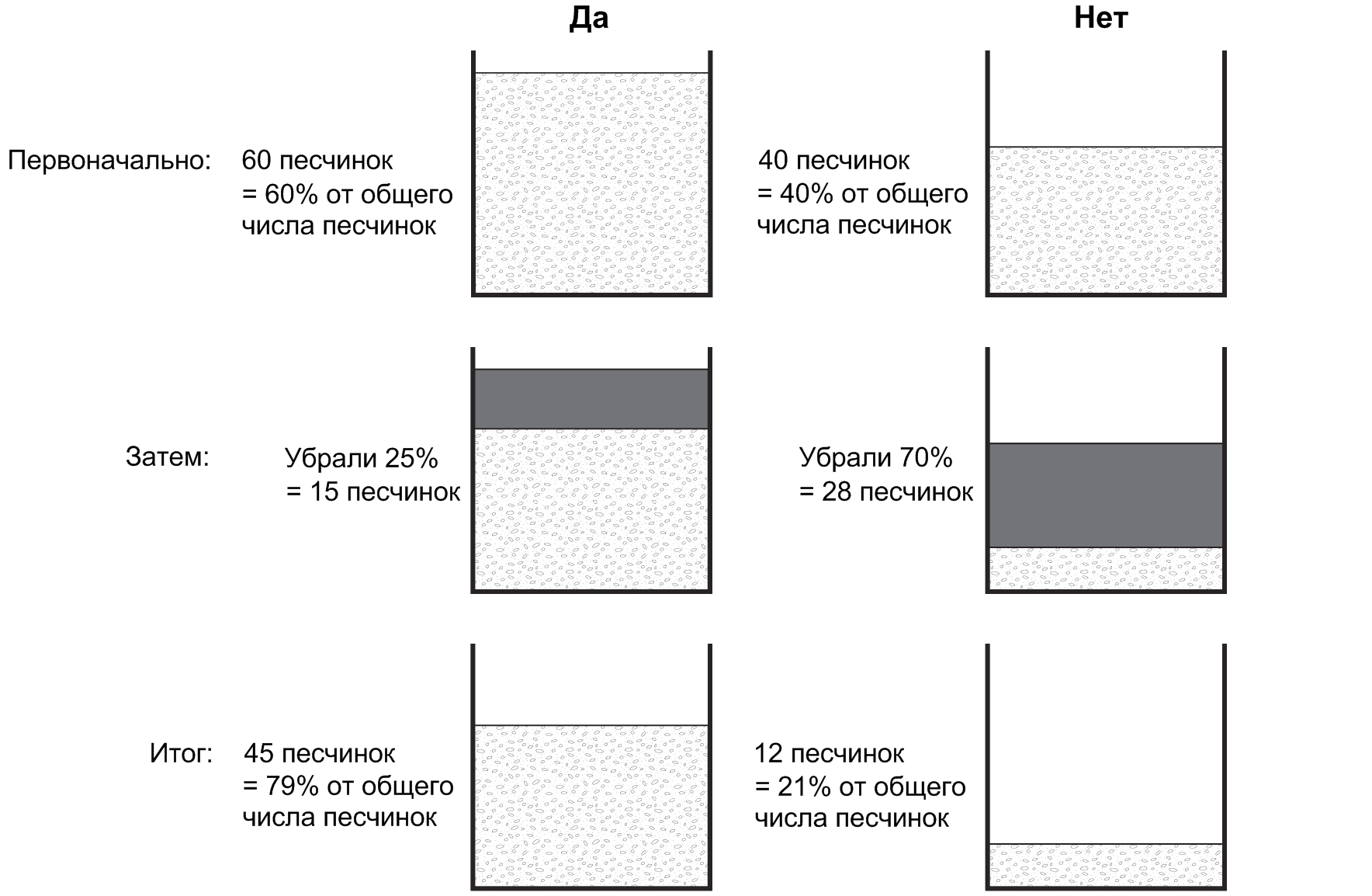 Допустим, к вашей радости, пассия останавливается и говорит: «Привет!». Каковы шансы, что она примет приглашение на выпускной бал? Преподобный Байес предписывает нам убрать 25% песчинок из банки «да» и 75% песчинок из банки «нет» (в обоих случаях это соответствует доле случаев, в которых наблюдаемый результат не состоялся бы). У нас осталось 60 x 0,75 = 45 песчинок в баночке «да» и 40 x 0,30 = 12 песчинок в баночке «нет». Согласно вышеприведённому правилу песчинок, уточнённая субъективная вероятность для «да» — это число песчинок в баночке «да» (45), делённое на общее число песчинок в обеих баночках (45 + 12 = 57). Получается 0,79.