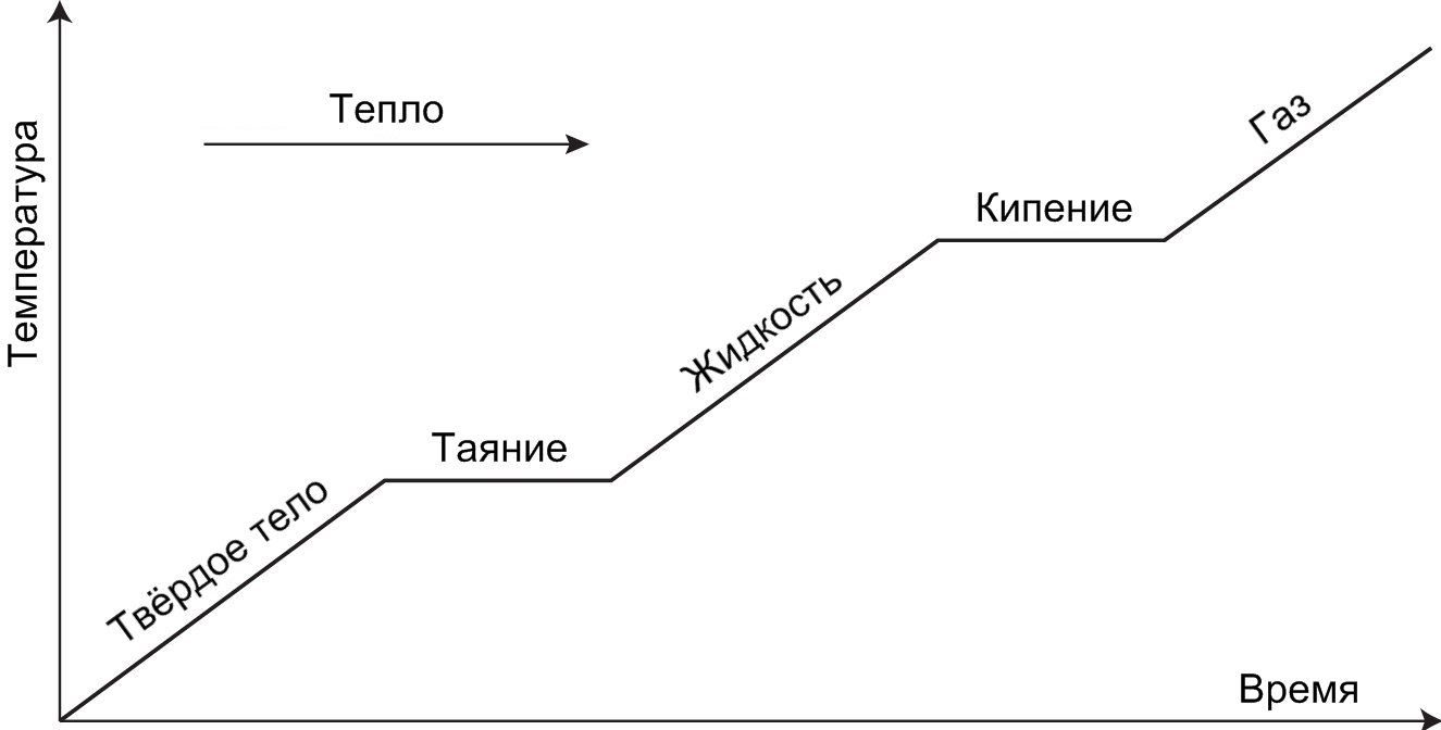 Изменение агрегатных состояний воды по мере её нагревания: твёрдое тело, затем жидкость, затем газ. Уровни таяния и кипения напоминают плато; на данных этапах внутренняя молекулярная структура видоизменяется, хотя температура и остаётся фиксированной