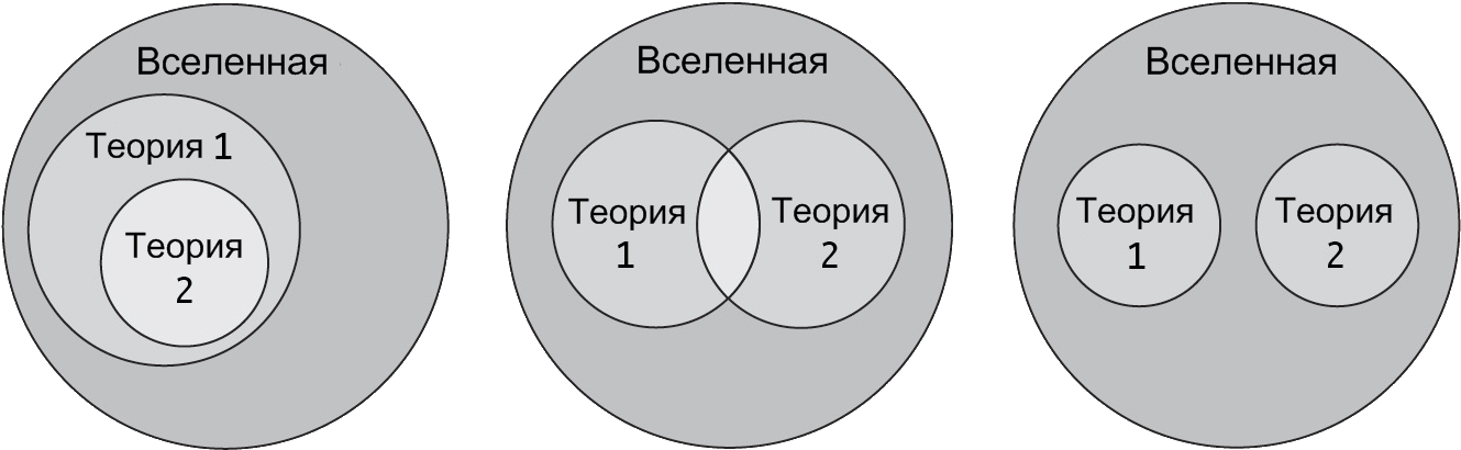 Такая ситуация — два способа рассуждения, область применения одного из которых полностью входит в состав области применения другого, — конечно, не обязательна. На схеме показаны различные способы сочетания областей применения друг с другом. Одна может быть подразделом другой; две могут различаться, но пересекаться; они могут быть совершенно разными и вообще не содержать общих ситуаций. Например, в теории струн, которая сегодня является основным кандидатом на роль теории квантовой гравитации, существуют «отношения двойственности» между теориями и складывается промежуточная ситуация: имеем две теории с пересекающимися областями применения.